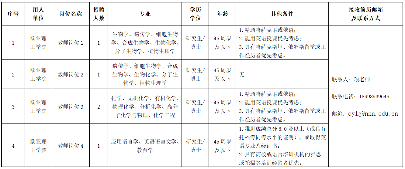 2025年5月,教育部正式批复同意我校与哈萨克斯坦欧亚国立大学合作举办非独立法人中外合作办学机构—南宁师范大学欧亚理工学院。欧亚理工学院以服务“一带一路”倡议和中哈命运共同体建设为使命,旨在充分发挥中哈两校优质教育资源,面向生物科学、化学及应用化学领域,培养具有扎实学科理论基础、创新实践能力及国际化视野的高素质复合型人才。现根据欧亚理工学院发展需要,面向海内外招聘优秀博士人才。